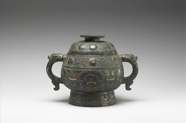 附蓋圓簋,子母口、雙耳、圓腹、圈足,耳作獸首形附珥。全器錯金銀,蓋、頸飾冏紋、夔紋,腹飾波帶紋,足飾鳥紋,均以雷紋為地。蓋、器均有銘四行。