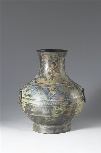 圓壼,侈口、獸首銜環耳、圈足。腹飾弦紋。