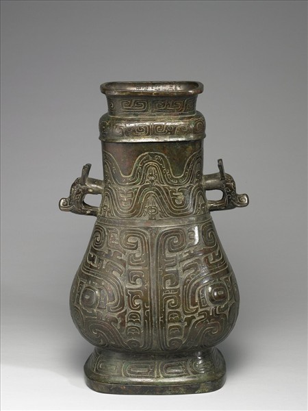 橫切面近橢圓形,近口與足兩端漸趨矩形,口下有波帶雲紋二層,腹飾大寬條雲雷紋獸面,皆以細小雲雷紋填空,足飾重環紋,蓋頂飾目雷紋一,兩耳作獸首形,蓋緣及蓋足內外飾竊曲紋。