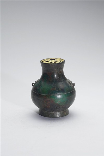 敞口,微束頸,斜肩,雙獸首銜環耳,球腹,高撇圈足。耳部之環固定於器身上。器腹中央帶一道寬弦紋,餘地光素。此壺內附一鎏金金屬膽,使此壺除了做盛水器外,兼具有花插功能。