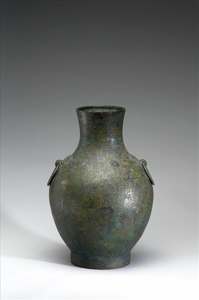 侈口,短頸,鼓腹,圈足。肩部兩側設獸首銜環。全器鏽層較厚,隱約可見紋飾鑲嵌。