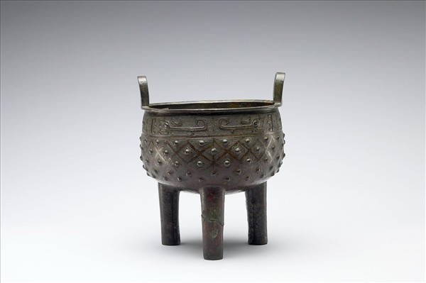 圓鼎,立耳、柱足,一足有裂傷。口外飾夔紋、雲雷紋為地,腹飾外環以雲雷紋菱格之乳丁紋。