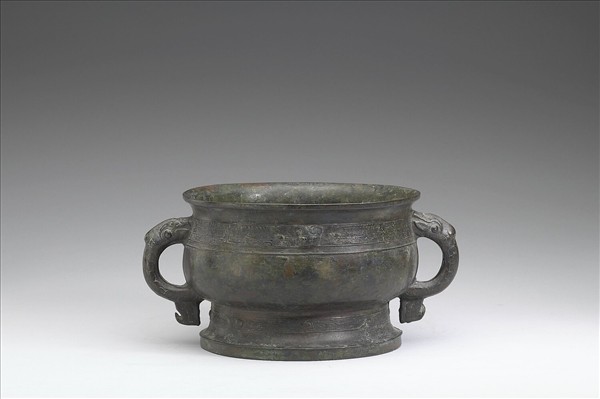 圓簋,侈口、雙耳、圓腹、圈足,耳作獸首形附珥,附玉頂木蓋,蓋殘玉頂鬆脫。頸飾獸面紋,中央有小獸首,足飾目雷紋。器內有銘兩字。