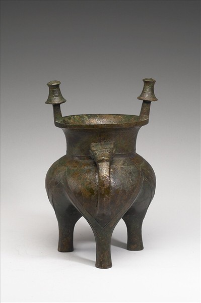 分襠斝,侈口、直頸、鼓腹,口沿上有一對立柱,一足側出獸首鋬。立柱飾獸面紋,頸、腹、足飾弦紋。鋬內有銘三字。