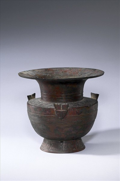 尊,敞口、折肩、圓腹、圈足微撇。折肩處設三獸首,肩部和足部之竊曲紋粗疏,不甚規整。