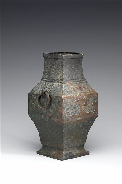 鈁,方口、折肩、方腹、方足微撇,肩作二獸面銜環,一鋪首傷斷、一環落。頸、肩、腹皆飾雲紋。