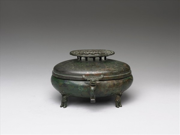 橢圓形盦,直口,雙螭耳,圓鼓腹,圓底,四人形足,帶鏤空圈足鈕穹頂蓋。全器外壁光素無紋,四足各為一抽象人形,雙手向後作抬舉狀而撐起器身。蓋鈕飾相互勾連之幾何紋。著錄於《西清續鑑‧乙編》卷十七頁三,作「周螭耳盦」。