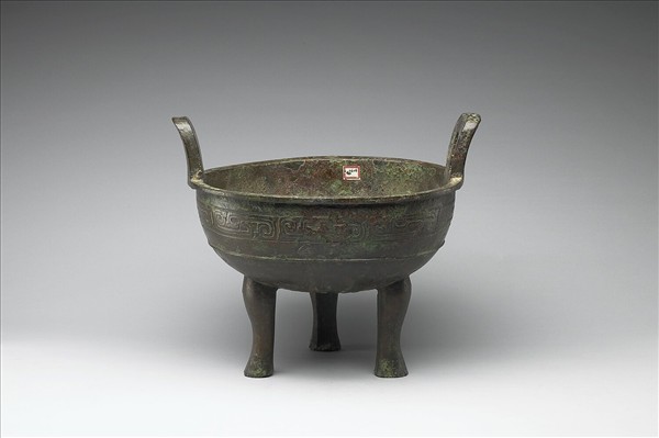 侈口,立耳外撇,淺腹,蹄足。腹飾無目竊曲紋,下有一凸棱。