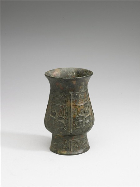 橢圓形,侈口,束頸,鼓腹,圈足微撇。頸、腹、足皆有棱脊,附木座。頸、足皆飾夔紋,雲雷紋為地,腹飾獸面紋,雲雷紋為地。