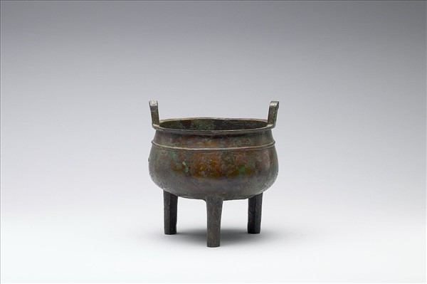 立耳、口折沿,垂腹,柱足。口沿下方飾一道凸弦紋。