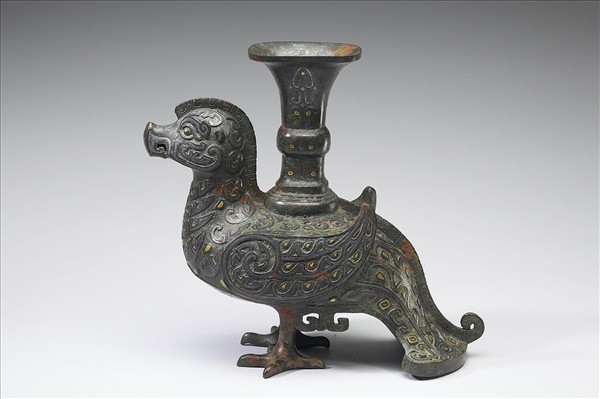 本件著錄於《西清續鑑》,作「漢天雞尊一」。整體作鳥形,背上負尊,這類負尊鳥形器通常稱為「天雞尊」。通體錯以金銀,表面覆蓋著青綠、赭色的假鏽。經過放大,可見綠色的假鏽中有孔雀石屑。