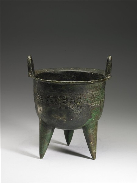平口沿外折,立耳,圓腹,錐形足。器腹中央飾一道寬帶,寬帶上下緣各飾一周圓圈紋,中間為獸面紋。