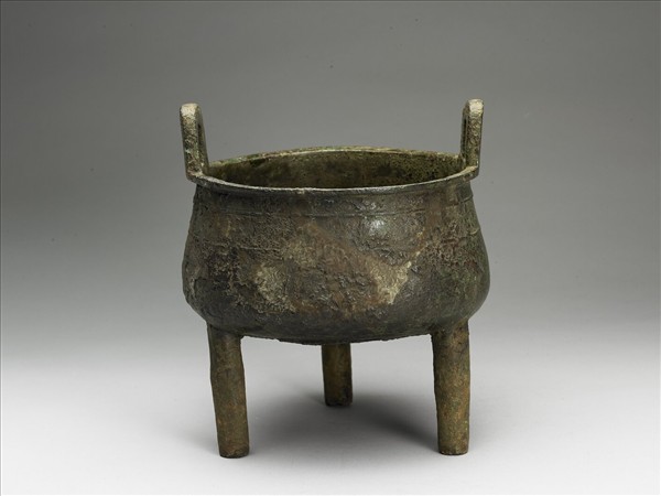 鼎,立耳、盤口、垂腹、柱足。口沿下飾兩道凸弦紋。一足有修補痕。