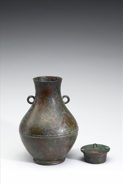 帶蓋圓壺,鼓腹、圈足,肩上二環耳,蓋作子母口式,三環鈕、二環脫落。腹飾弦紋。