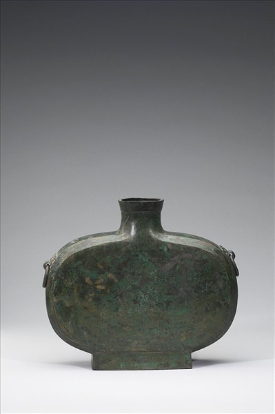 扁壺,盤口、短頸、斜肩、扁腹、方圈足,器肩兩側有鋪首銜環。
