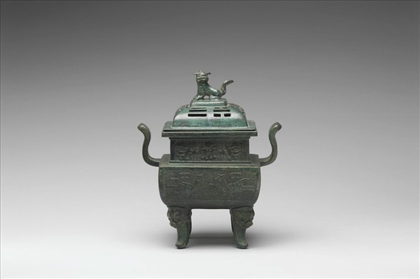 附蓋方鼎,獸鈕、子母蓋、盤口、直頸、雙耳、獸足。蓋為鏤空八卦,頸飾獸面紋,腹飾鳥紋,以雷紋為地。