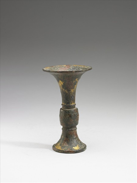 侈口,鼓腹,圈足。腹部紋飾為銅鏽所掩,全器鎏金。