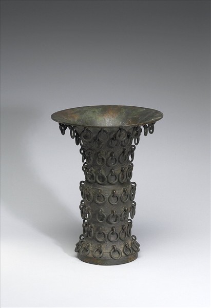 尊,敞口、筒腹、矮圈足。全器飾雲雷紋、圓渦紋等幾何紋,外飾百環。底內有銘四行十五字。
