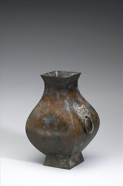 鈁,方口微侈、四壁圓曲、方足,肩作二獸面銜環。