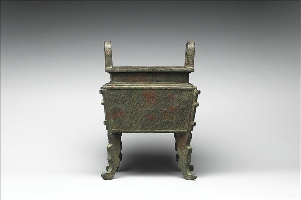 方鼎,立耳、頸內縮、平底、扁足,腹有棱脊。頸、腹均飾雷紋,足飾夔紋。