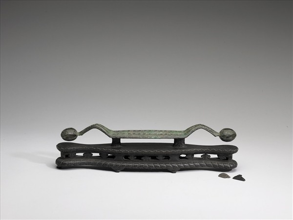 弓形器,器身平直,兩端向上向外作對稱雙勾如臂身,兩側末端飾鈴首,附木座。器身飾乳丁紋。