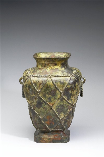 鈁,方口圓曲、折肩、方足圓曲,肩作二獸面銜環。腹環以繩紋,環作連珠狀。