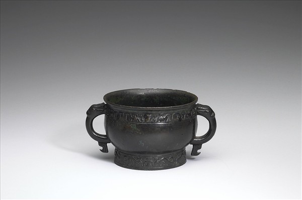 侈口,雙耳,圓腹,圈足,耳作獸首形附珥。頸飾象紋,中央為小獸首,足飾夔紋。器內底有銘文二行。