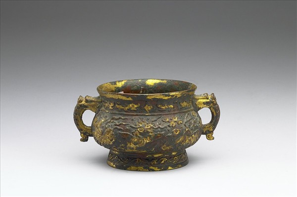 圓簋,盤口、雙耳、圓腹、圈足,耳做獸首形,下有附珥。口沿下飾夔龍,腹有雲龍紋,圈足飾蛇紋。局部鎏金。