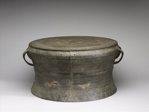 鼓身分為三段,鼓胸向內收斂,縮腰,足外撇。鼓胸左右各有兩扁環耳。鼓面中心飾十二芒的太陽紋,芒間作翎眼紋。暈圈可見直紋和變形翔鷺紋等。鼓身飾雲雷紋和三角紋等。
