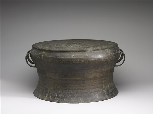 鼓身分為三段,鼓胸圓突,縮腰,足外撇。鼓胸左右各有兩扁環耳。鼓面中心飾十二芒的太陽紋,芒體細長。暈圈飾乳丁紋、直紋、變形翔鷺紋等。鼓身飾雲雷紋、卷雲紋和複線三角紋等。