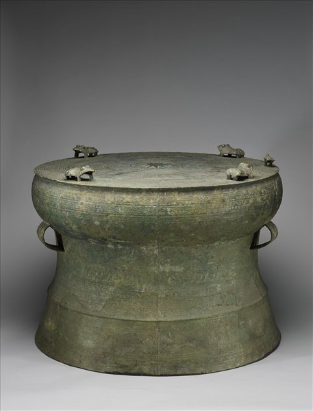 南方銅鼓。鼓身作三段,中空無底。鼓胸圓凸,腰部內縮,圈足外撇。胸、腰之間有三扁環耳,耳上有長方形穿孔。鼓面中心飾太陽紋,十二芒,芒體浮凸,芒間作翎眼紋。暈圈由內至外可見雲紋、變形羽人紋、變形翔鷺紋、眼紋。鼓面邊緣有四隻立體青蛙塑像,蛙身飾十字紋帶。其中兩蛙間另有一立鳥。鼓身亦滿布紋飾,主要有變形划船紋、複線交叉紋、圓圈紋、水波紋等。根據出土資料,此鼓應屬廣西冷水沖型,年代約為東漢晚期至南朝。