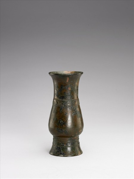 觶,侈口、束頸、鼓腹、圈足微撇。頸飾目雷紋,足飾弦紋。