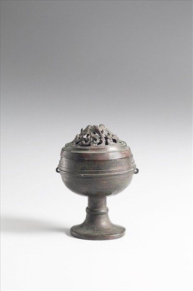 博山爐,子母式口、圓腹、短柄,腹作二獸首耳。蓋飾鏤空山形紋,下飾連山紋,腹飾蟠虺紋、連山紋、幾何紋,柄飾連山紋、蟠虺紋。