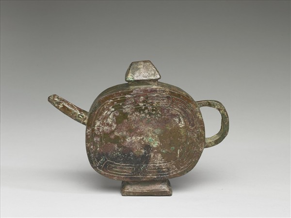 盉,梯形鈕,扁圓腹,管形流,環把,方圈足。腹部飾重環紋。