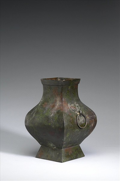 鈁,方口,四壁圓曲,方足微撇,肩作二獸面銜環。