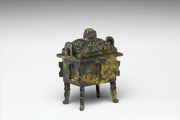 附蓋方鼎,盤口,立耳,平底,扁足,腹有棱脊,蓋附獸鈕。局部泛金。腹飾夔紋、獸面紋,足飾夔紋,蓋飾鏤空蝙蝠,蓋緣為幾何紋。