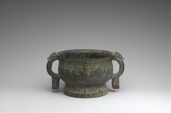 圓簋,侈口,雙耳,圓腹,圈足。頸飾夔紋,中央為小獸首,下為弦紋,足飾夔紋。