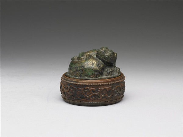 器呈半球體,作虎形蜷臥狀,尾繞經腹部內側向脊背彎捲外翻,項背中央一道陰線隋形彎曲;前足並放,雙目有神。器下連著圓片基座,係與器身合鑄,底心中央灌鉛,俾增重量,適於壓物。器表鎏金,現綠斑。《楚詞‧九歌‧湘君》︰「白玉兮為鎮」,東漢王逸注日:「以白玉鎮坐席也。」在桌椅普遍使用之前,人們只能坐地於席上,席的四角需有壓鎮之物,以免吹移掀起。戰國、漢墓中常有四個一組的銅獸鎮出土,即具此種席鎮功能。宋以後,文人常取以為鎮紙之用。錄於《西清續鑑.乙編》卷十八頁十六,作「唐瑞獸書鎮一 」,清宮配以木座。