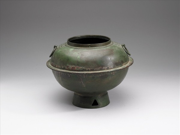 鍑,直口,斜肩,圓腹,高圈足。肩上有鋪首銜環,腹部最大徑有一凸棱。