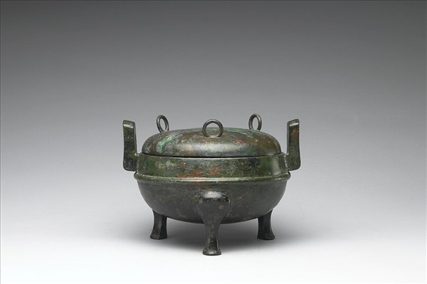 附蓋圓鼎,子母口、立耳、深腹、蹄足,蓋呈半球形,附環鈕。腹飾弦紋一道。口沿有銘。