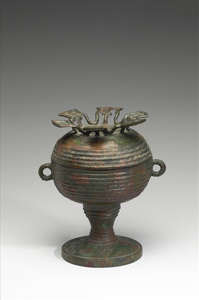 豆,蓋與腹呈圓球體,蓋附捉手,捉手呈鏤空六瓣葉形,子母口、環耳,柄為高圈足。蓋、腹、足均飾瓦紋。