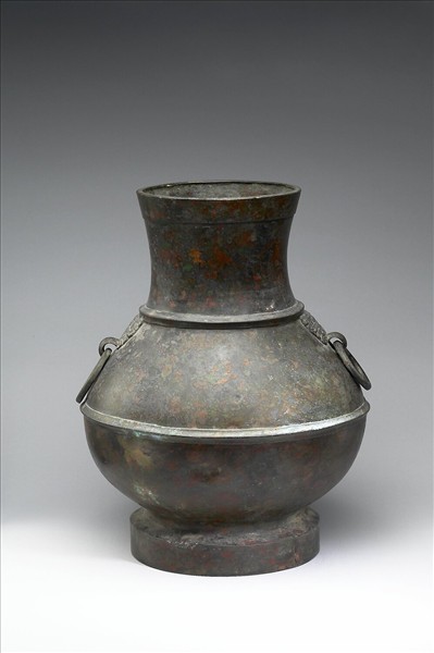 圓壺,鼓腹、圈足,肩上二獸面銜環。肩、腹飾弦紋。