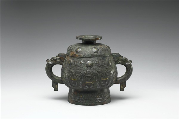 附蓋圓簋,子母口,雙耳,圓腹,圈足,耳作獸首形附珥。全器錯金銀,蓋、頸飾冏紋、夔紋,腹飾波帶紋,足飾鳥紋,均以雷紋為地。蓋、器均有銘四行。