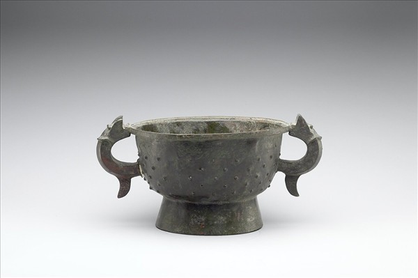 圓簋,盤口,雙耳,圓腹,圈足,耳做獸首形,下有附珥。器腹飾乳釘紋。無底紋。