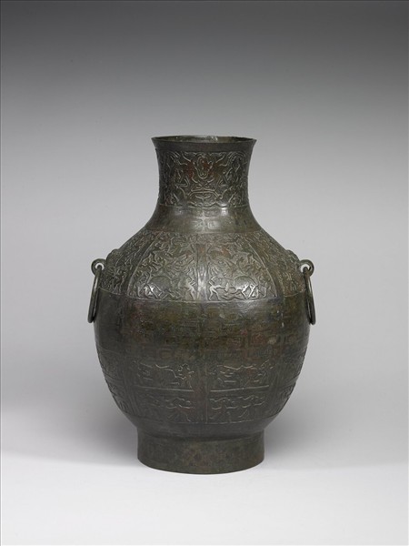 微撇口,長頸,斜肩,雙獸首銜環耳,長鼓腹,高圈足。遍體飾獵紋三道,圖鳥獸及人物射獵之狀,姿態生動。銘文一字,在底上,陽識。