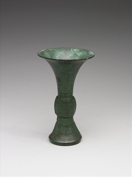 觚,敞口,鼓腹,高圈足,圈足有十字孔。腹與圈足滿布雲雷紋,圈足另有獸眼紋,圈足內有一亞形銘文。