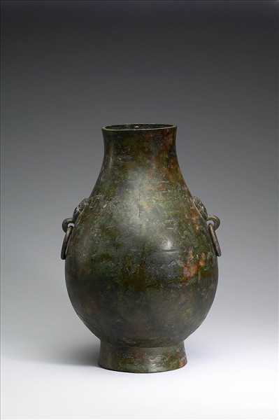 圓壺,鼓腹,圈足微撇,肩上二獸面銜環。全器鑲嵌飾獸紋。