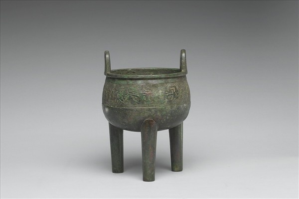 圓鼎,盤口,立耳,柱足。腹飾獸面紋,以雷紋為地。