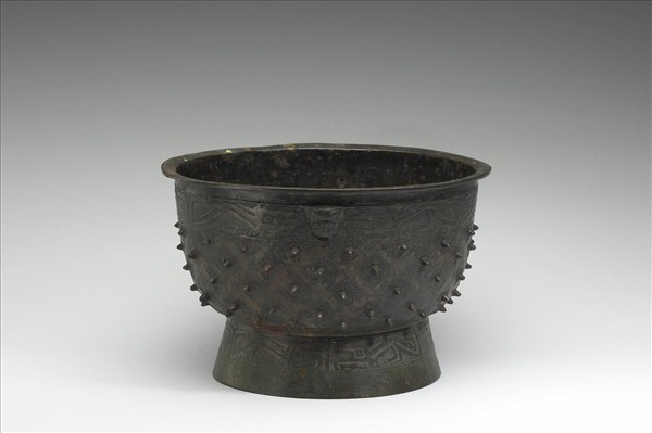 圓簋,盤口,圓腹,圈足。頸飾夔紋,中央有小獸首,腹飾乳丁紋,足飾夔紋,均以雷紋為地。