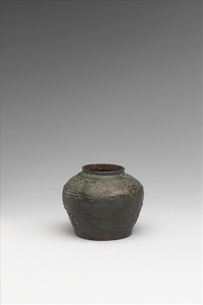 罍,圓腹,平底。腹中央弦紋一道,上下各飾蛇紋,以雷紋為地。